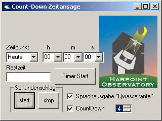 Unser kleines Tool ist in der Lage, die Zeitspanne bis zu einem vorgegebenen Zeitpunkt in der Zukunft über die Soundkarte laut und deutlich in deutscher Sprache zu melden. Je näher der Zeitpunkt heranrückt, desto öfter erfolgt die Ansage. Zum Schluss werden die einzelnen Sekunden bis zum Count-Down von minus Zehn heruntergezählt. Der Countdowner ist ein Abfallprodukt unseres inzwischen sprechenden Sternwarten-Leitsystems. Wir verwenden die Zeitansage dort als Hilfe bei der Beobachtung von Bedeckungen und beim Start einer Satellitennachführung. In der neueren Version kann auch eine Zeitspanne angegeben werden. Abspeichern der Momentanzeit in einer Datei "zeitnehmung.txt" (Zeitauflösung 1/100 Sek) zum Abstoppen von Bedeckungsereignissen ist ebenfalls neu. Das Ding eignet sich somit als Hilfe für Langzeitbelichtungen oder als Hilfe zum kochen von Frühstückseiern.