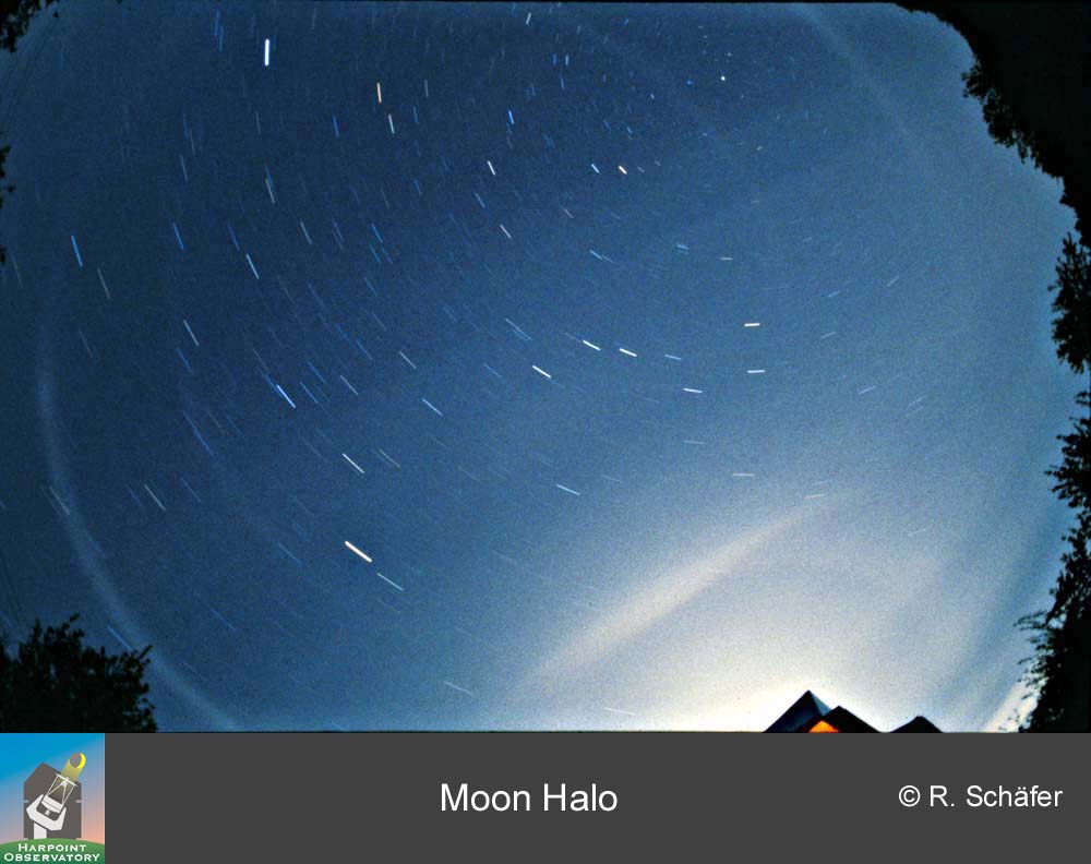 | 10.07.1989 komplexes Mondhalo Fisheye f=16mm, Dia, Aufnahme von der Sternwarte Harpoint (Kuppel deckt Mond ab) Auf dieser Aufnahme sind zahlreiche Haloerscheinungen sichtbar. Einige davon sind nur selten zu beobachten, manche sogar extrem selten. Leider konnte das Foto wegen der Suche nach Kamera, Film und Stativ erst eine halbe Stunde nach der Wahrnehmung dieser großartigen Himmelserscheinung aufgenommen werden. Viele der zuvor visuell extrem deutlich sichtbaren Strukturen waren da schon verblasst. Eine Analyse der Aufnahme durch Herrn Patrik Trncak, siehe nächstes Bild [Datei 63 kB]
