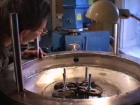 Die Hauptspiegelzelle ist zur Herstellung der seitlichen Bohrungen am Support der Drehmaschine aufgespannt