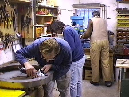 Fleißig wird zu Dritt in der Werkstatt gearbeitet. Im Vordergrund sieht man das Abschleifen der Schweißnähte im Inneren der Hauptspiegelzelle