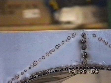 Die mit dem MIG-Gerät innen gesetzten Schweisspunkte hinterlassen aussen diese charakteristischen Marken. Weiters ist deutlich ein Spalt zwischen dem Zylinder und dem Deckblech zu erkennen. Der Spachtelkitt wird später diesen Spalt füllen.