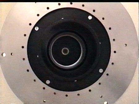 | Blick vom Instrumentenflansch durch die Blendenrohre auf die leere Sekundärspiegelzelle. Die ringförmige Aufhellung ist auf die restliche Reflexion der Werkstattbeleuchtung am Ende des mit schwarzem Schultafellack behandelten Blendenrohres zurückzuführen.