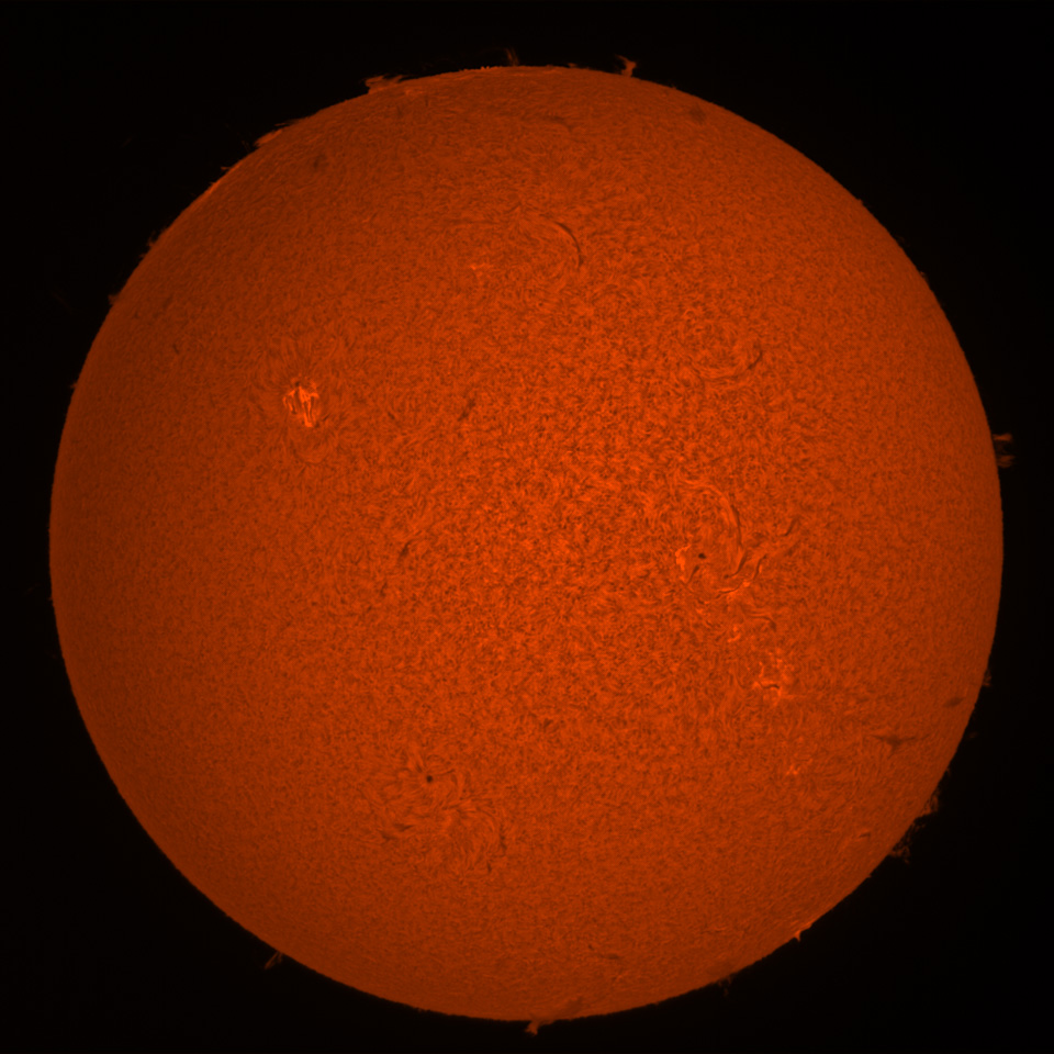 | 15.06.2014 Sonne im Halpha-Licht, aufgenommen mit ZWO ASI120MM CCD-Kamera durch Lunt LS60mm + Double Stack Filter, mit Shapley-Linse auf f=250mm verkürzt, 3.6msec Belichtungszeit je Einzelbild, 76 v. 306 Bilder mit Autostakkert aufsummiert, Sternwarte Harpoint