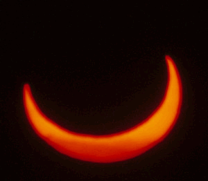 Animierte Diaserie: Der Mond bewirkt eine scheinbare Drehung der sichtbaren Sonnensichel, aufgenommen mit NIKON und 600mm Teleobjektiv am frühen Morgen vor der Kirche in Sommerholz 7km von Harpoint entfernt
