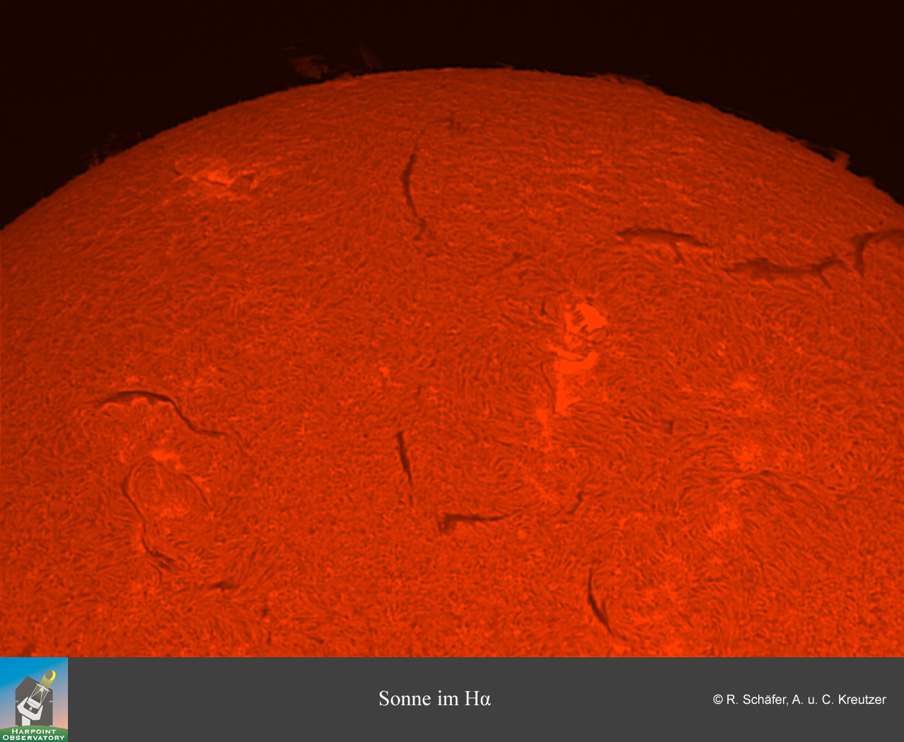 | 29.03.2014, 14:51 MEZ Sonne im Halpha-Licht, aufgenommen mit ZWO ASI120MM CCD-Kamera durch Lunt LS60mm + Double Stack Filter, mit Barlow-Linse auf f=1000mm verlängert, 80 v. 160 Bilder mit Autostakkert aufsummiert, Wavelet-Filterung in Registax 6, Sternwarte Harpoint