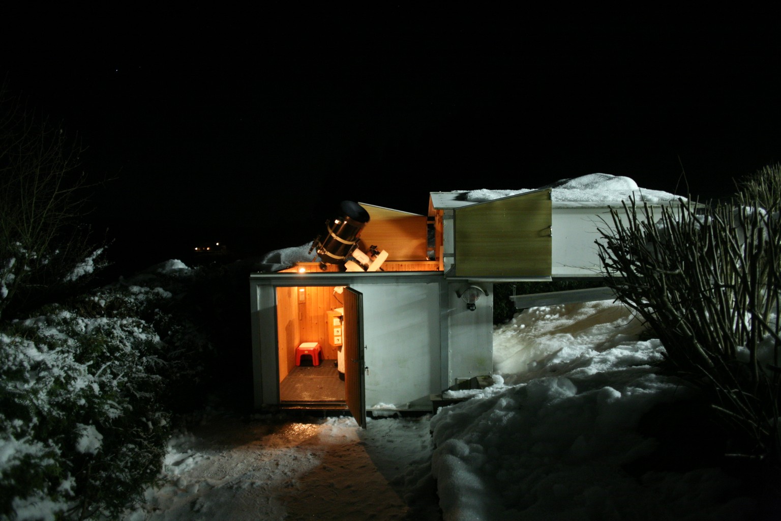 Der kleine astronomische Gartengeräteschuppen bei offenem Rolldach mit dem C14