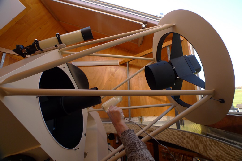 Die Inbetriebnahme der Sternwarte in den Morgenstunden erfordert ein Trocknen des Sekundärspiegels. Die Beobachtung eines ISS Tagesüberfluges im großen Teleskop steht bevor